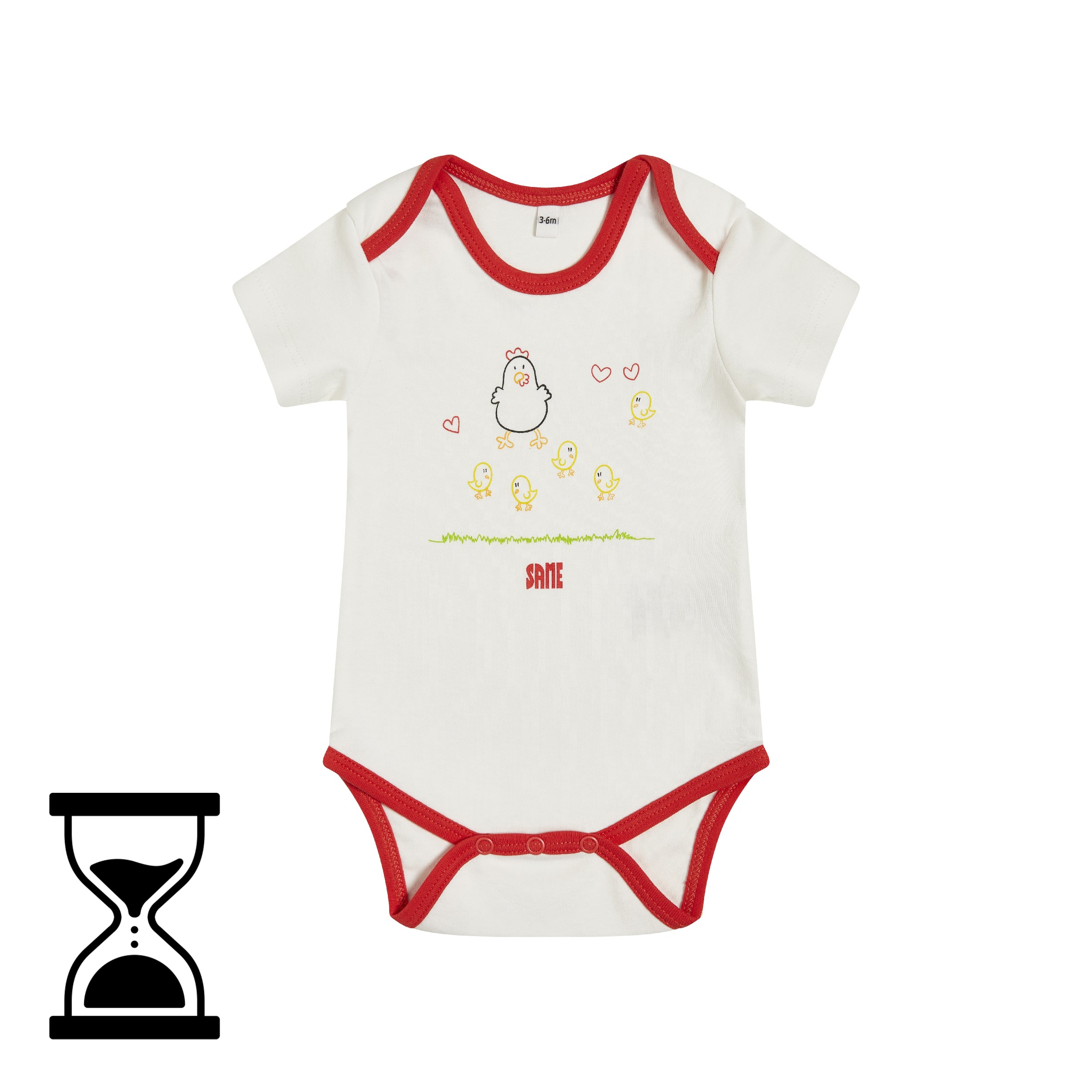 O body de manga curta para bebé SAME é uma peça de vestuário adorável para os mais pequenos, inteiramente em tecido de algodão branco. As bordas são vermelhas em contraste e apresentam um estampado de pintinhos na frente, juntamente com o logótipo SAME vermelho. O body está equipado com um prático fecho que permite vestir e despir facilmente o bebé.